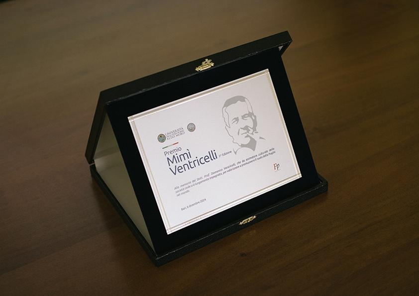 Il premio è intitolato alla memoria del Dott. Prof. Domenico Ventricelli, laureato in Lettere e Scienze Politiche presso l’Università degli Studi di Bari Aldo Moro, che da professore prima e da animatore culturale della società civile poi, si è lungamente impegnato per valorizzare in modo esponenziale il nome e il ruolo della Puglia nel mondo.